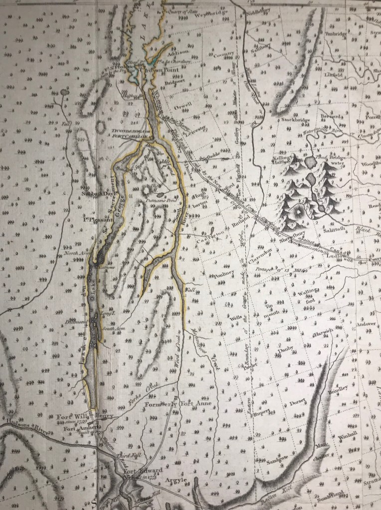 Note Fort Ticonderoga, formerly Fort Carillon, located where Lake George joins Lake Champlain (in the upper left of the last image) and the upper reaches of the Hudson River (in the lower left), guarded by Fort Edward, which at the time was little more than a wooden stockade.