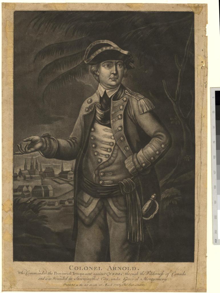 I’ve been researching a historical set during the Revolution and in the process I have discovered a great many myths about Arnold, often repeated as facts. One of my favorite fantasies about Arnold is the persistent myth that, on his deathbed, Arnold asked to be dressed in his old Continental Army uniform and ‘regretted that he had ever donned another’. This is patently preposterous since that would mean a) that he kept his uniform during the year following his shift of allegiance, during which he was actively attacking, invading, and planning against America, then the following 20 years, during which he was living in England, then several locations in Canada, then England again, and constantly sailing around the world on trading voyages, and b) that the uniform he wore when he was 40 would have still fit him when he was 60.