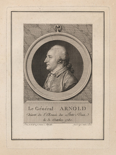 The engraved profile on the left is probably a more accurate likeness of Arnold. It is actually a copy of a portrait done by a French artist called du Simitiere, from life, when Major General Arnold was serving as Military Commander of Philadelphia. By October 3, 1780 (when this copy was presumably executed), most Americans wanted to execute Arnold. His defection had only just been discovered, and on that date there was a tremendous demonstration against him on the streets of Philadelphia (and cities all across America as the news spread). By then, Arnold had fled to British lines in New York City, where he took up arms for the King.